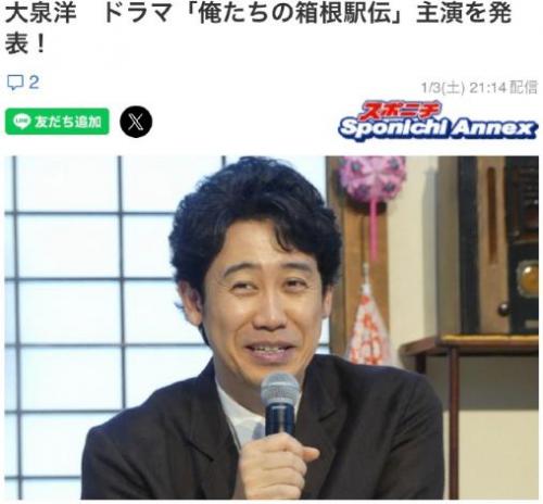 中国娱乐网讯 www.yule.com.cn 1月3日,日本电视台宣布,演员大泉洋(52岁)将于今年10月主演其周日剧场时段的新连续剧《我们的箱根驿传》。该剧改编自知名作家池井户润(代表作《半泽直树》、《下町火箭》)的同名小说,消息在当日回顾第102届箱根驿传的特别节目中公布。
